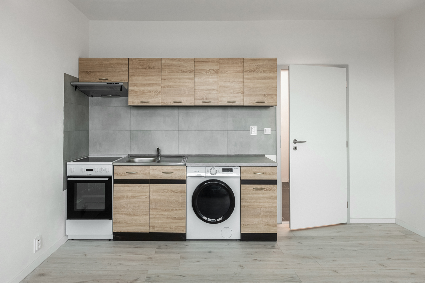 s plně vybaveným kuchyňským koutem (sklokeramická deska, trouba, digestoř, lednice i pračka).